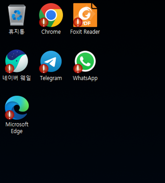 바탕화면의 아이콘들에 어느날 빨간딱지가 붙었다. 이상한 프로그램이 깔렸나, 바이러스에 걸렸나 걱정이 생겼다. 빨간 동그라미에 이상한 표시가 느낌표인지 한첨을 보고 알았다.