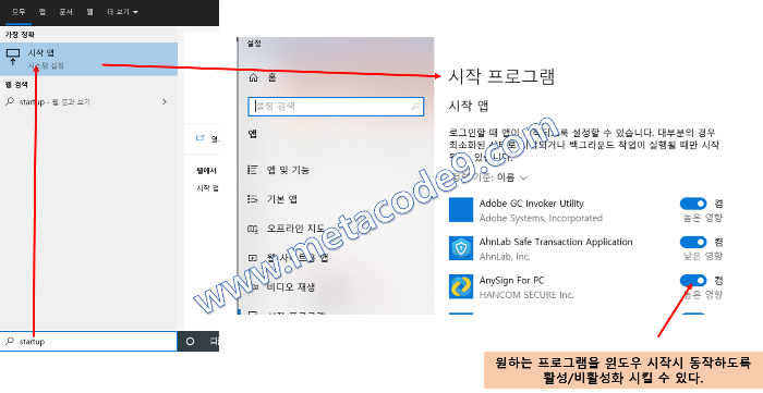 윈도우 키를 누른 상태 또는 하단의 검색상자에 놓고 startup 또는 시작을 쓰면 시작 앱을 선택할 수 있다.