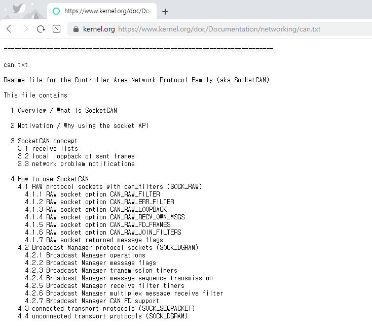Linux에서 CAN driver를 사용할 일이 생겨서, CAN driver관련 문서를 공부하고 있다. 그 중, 리눅스 커널의 can 설명 파일을 보면서, 정리 차원에서 여기에 다시 작성해 보았다. 이 글은 다음의 리눅스 커널 CAN 네트워크 문서 내용이다. 전체 내용은 8장까지 있으며, 내용은…