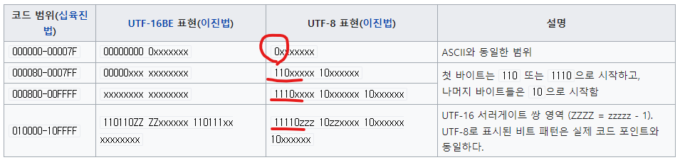 다음은 UTF-8이 어떠한 규칙으로 문자들을 표현하는지 표로 나타내고 있다.