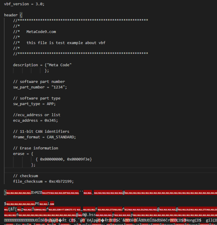 VBF 파일을 메모장 등으로 읽으면 헤더 부분은 아스키코드로 잘 읽을 수 있으나, 헤더 아래 부분은 Binary data 이기 때문에, 깨진 글자로 표시되고 있다.